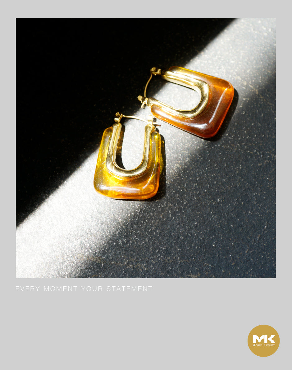 靈感源自復古琥珀與秋日暖陽的色調記憶,經典水滴輪廓搭配古橘色半透明樹脂,在光影之間綻放出溫潤內斂的光澤。