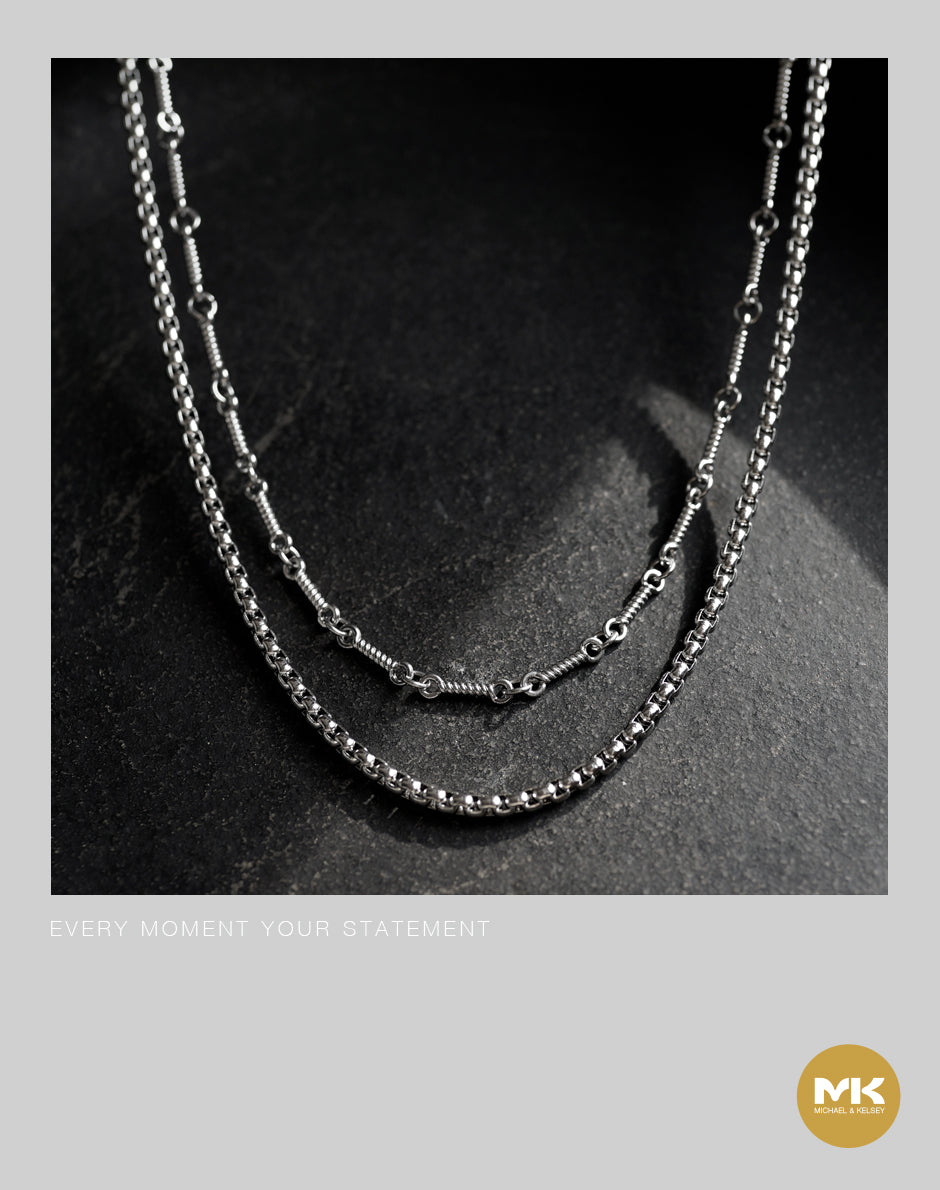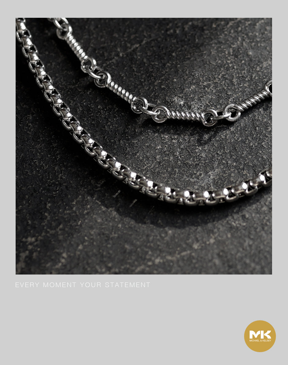 銀色麻繩鈦鋼雙鍊,以「繩」為靈感,將金屬柔化為肌理之美,