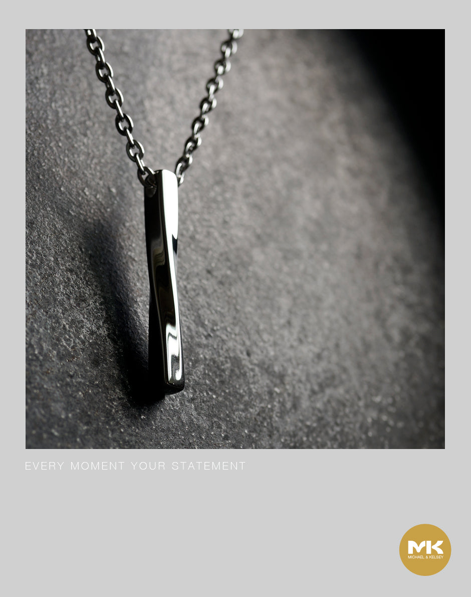 【扭轉立方體鈦鋼項鍊】以自然中岩層的擠壓、礦脈的變形為意象,