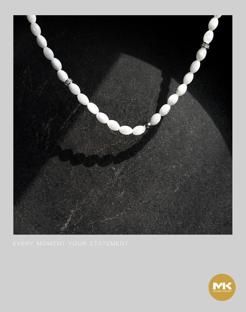 這款白色橢圓珍珠鈦鋼鍊,靈感源自自然的柔光與大地的平衡之美。
