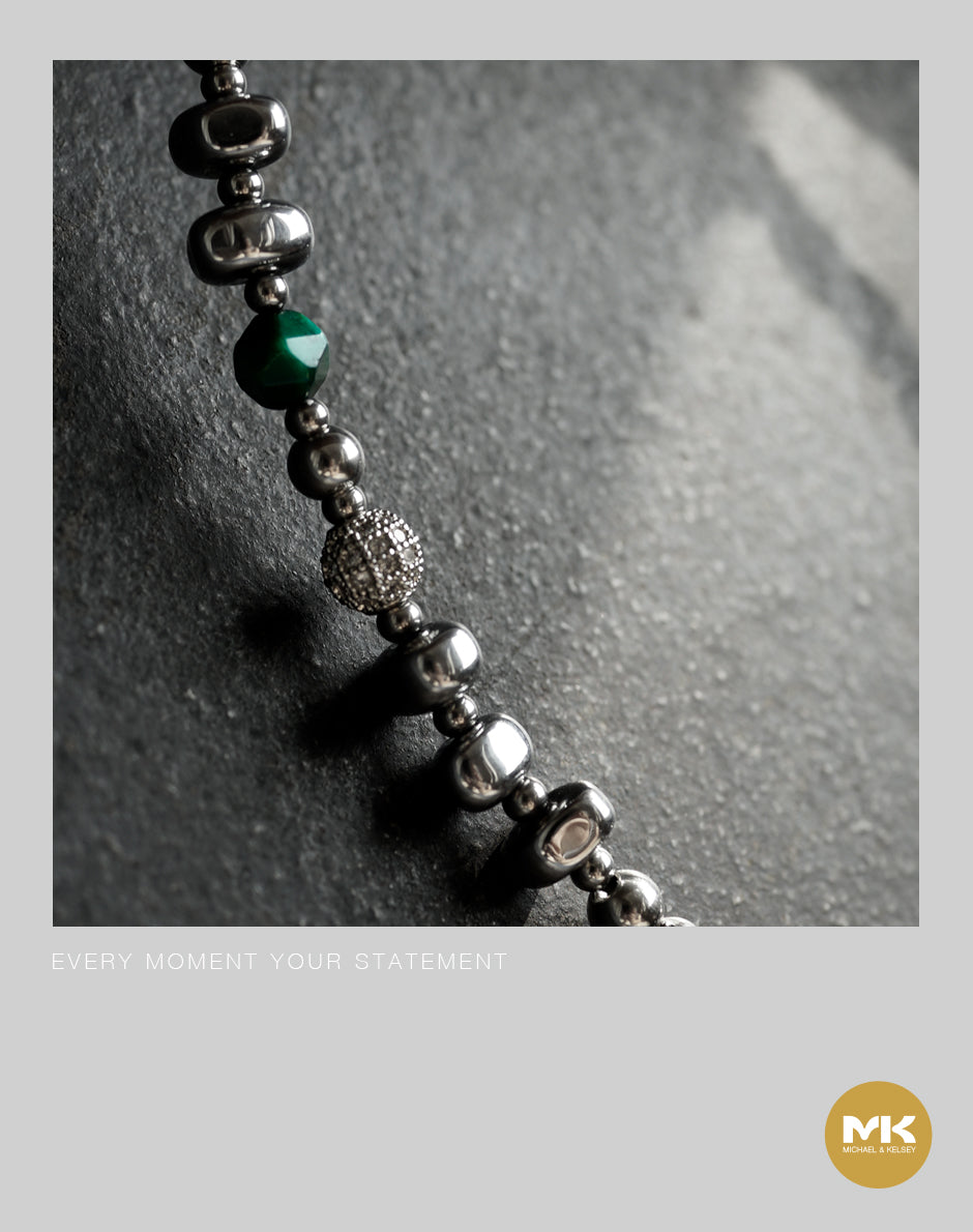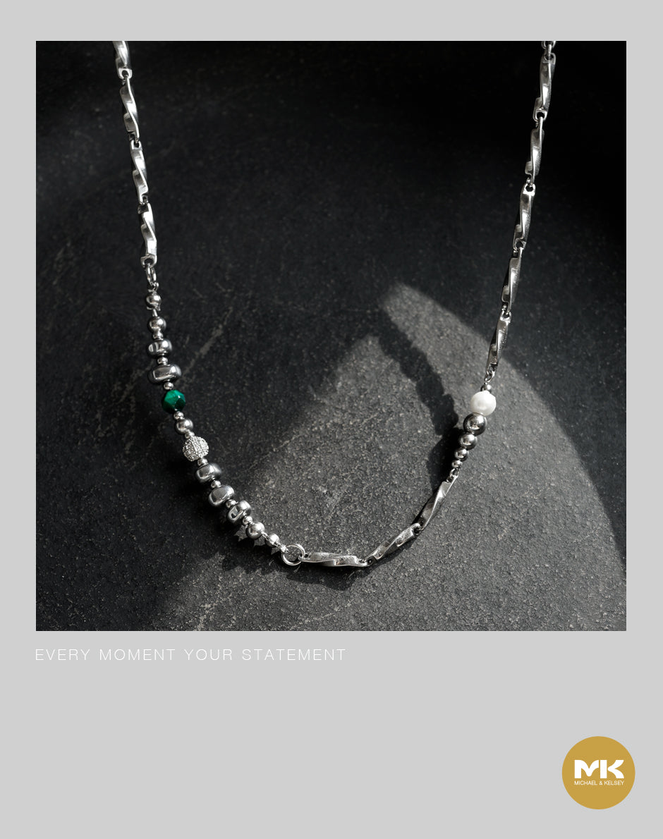 【綠天然石不規則珠鈦鋼鍊】延續「淬鍊大地系列」的自然語彙,