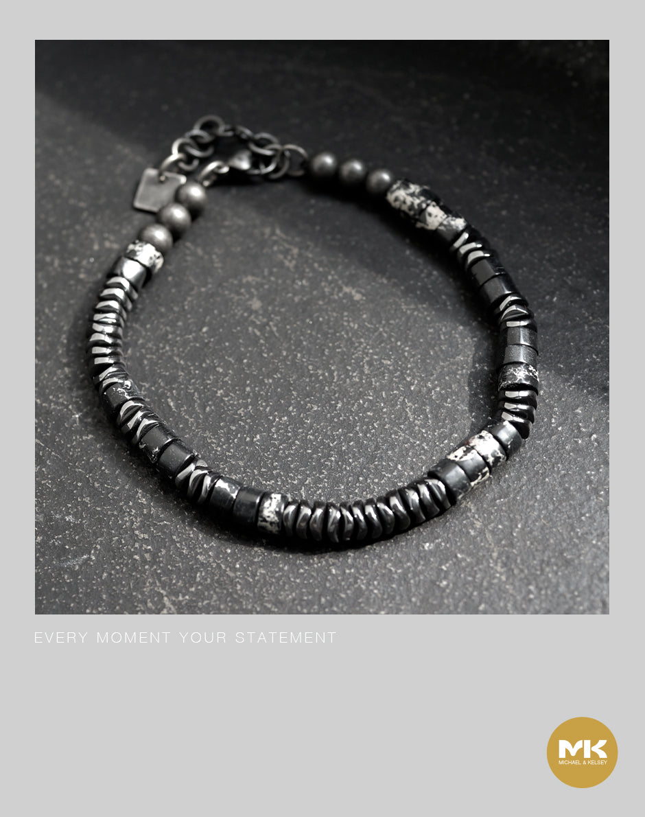 【黑灰天然石鈦鋼手鏈】以岩石與金屬的共生質感為靈感,
