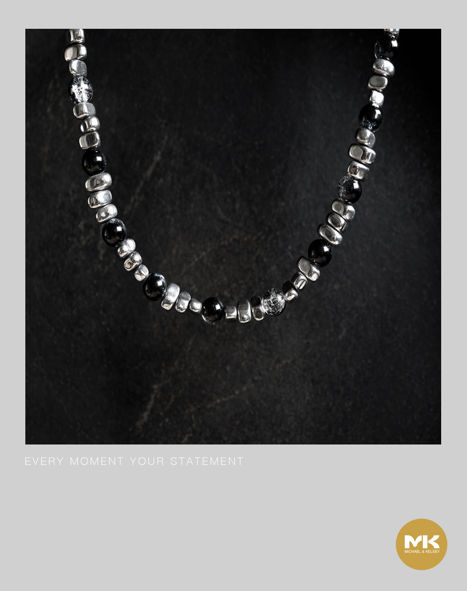 這款銀黑珍珠鈦鋼項鍊,平衡了古典與現代之間的比例,