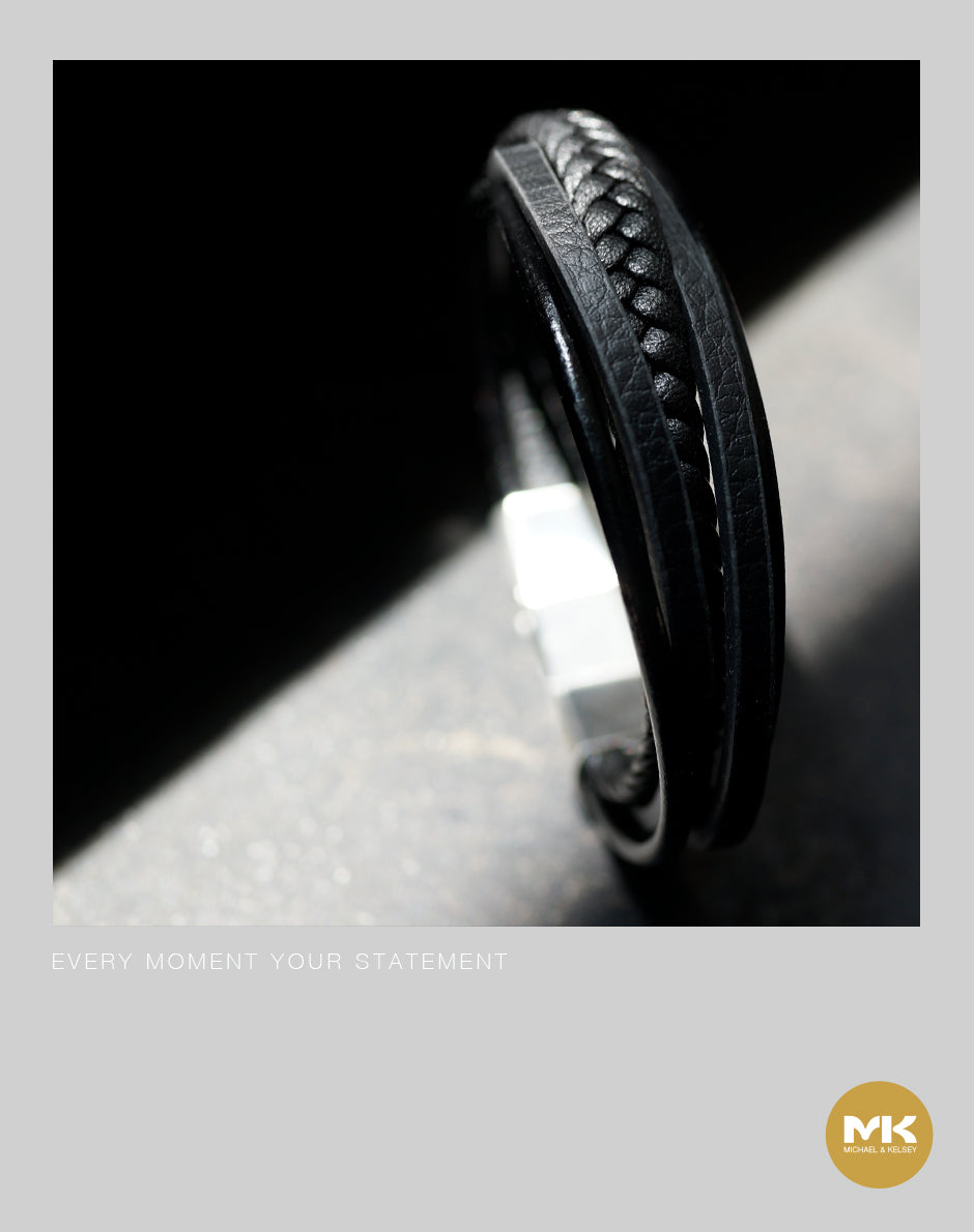 層層交織,如同性格的深度——不張揚卻難以忽視。選用高品質義大利牛皮,以多股編織設計纏繞手腕,細節間蘊藏節奏與秩序,展現剛柔並濟的風格語彙。鈦鋼磁吸扣環低調收尾,俐落卻穩固,為整體增添一抹沉穩態度。