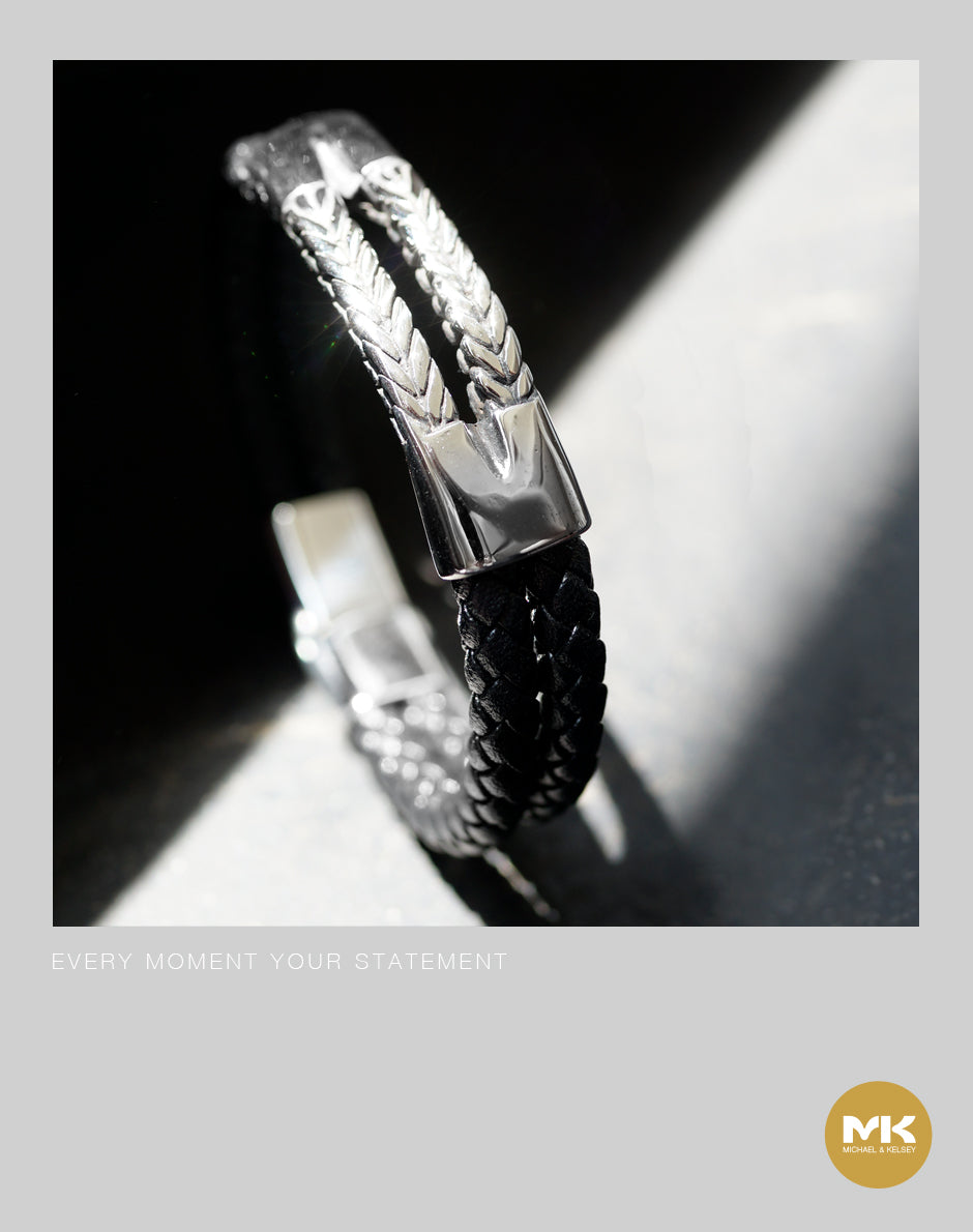 低調黑,雙股編織,將剛毅與細膩織入手腕之間。選用質地柔韌的義大利牛皮,以俐落的雙繩編織設計,展現簡約中的層次感。搭配霧黑鈦鋼磁吸扣環,開闔俐落、佩戴方便,於無聲中映現個人風格的內斂力量。